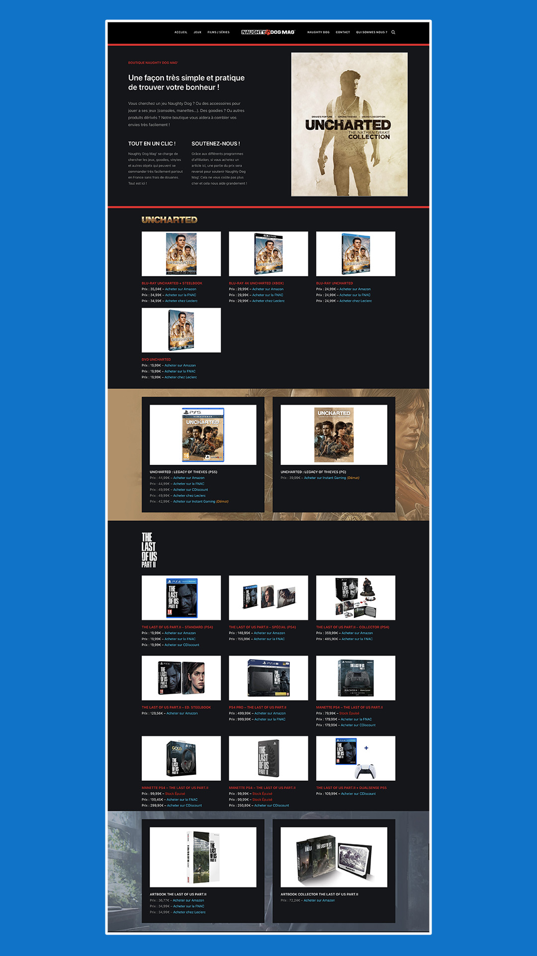 Enfin, la grande nouveauté, c’est l’arrivée de notre boutique ! Désormais, vous pourrez y retrouver de nombreux objets à acheter autour des jeux Naughty Dog. Aussi, sachez que pour chaque objet acheté, une partie des fonds serviront à soutenir Naughty Dog Mag’… Et cela ne vous coûtera pas plus cher !