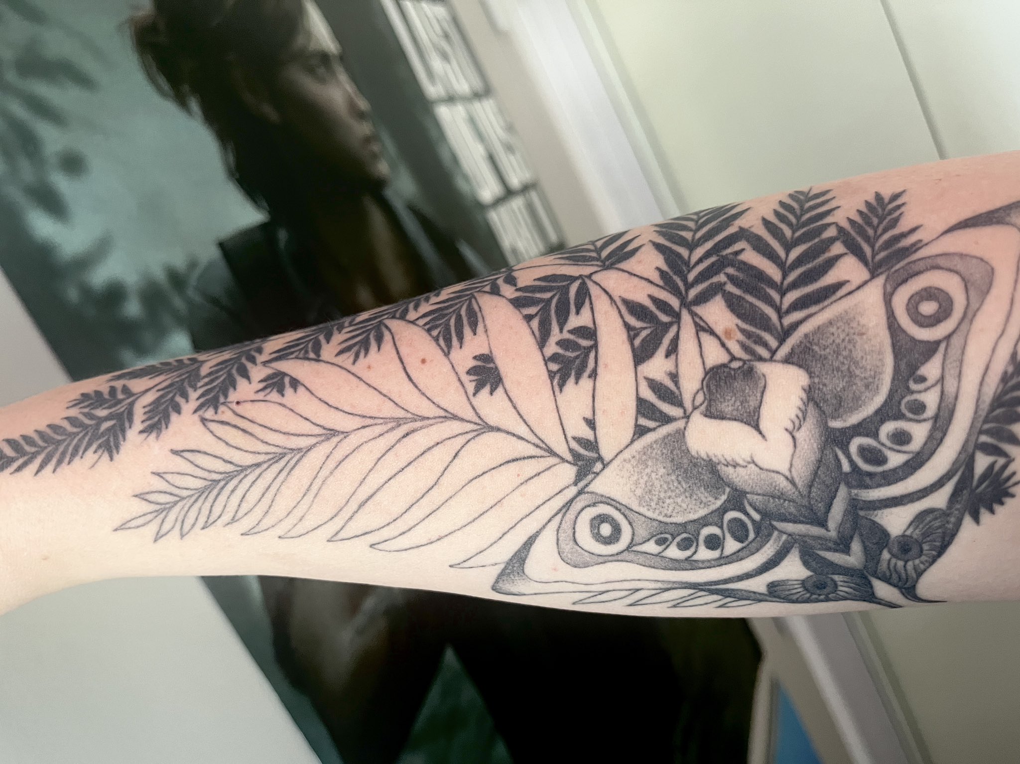Bien évidemment, le tatouage d’Ellie est devenu un incontournable en matière de tattoo The Last of Us. Créé par Natalie Hall, le motif combine un papillon de nuit et deux modèles de fougères. Entourant l’avant-bras et le poignet du personnage, c’est une pièce imposante que bon nombre parmi vous n’ont pas eu peur d’adopter.