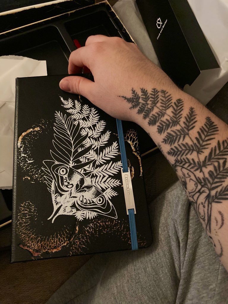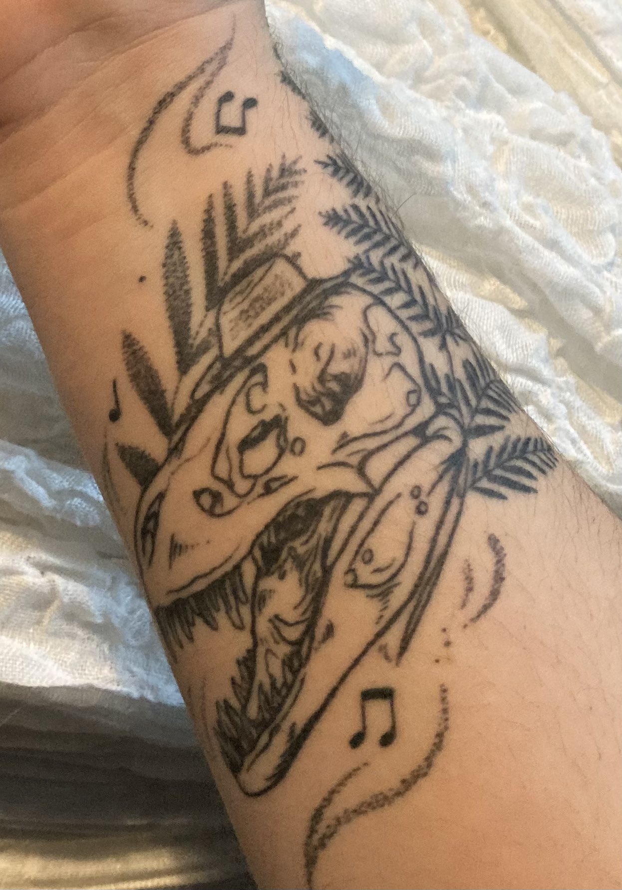 Reprenant le motif de la fougère, elle y a associé d’autres détails en référence à Part II : le crâne de dinosaure doté d’un chapeau, clin d’œil à la séquence du musée, ainsi que des notes de musique. Enfin, l’œuvre a été réalisée par Scapula, une des tattoo artists du Studio Jaune établi à Caen (Calvados, France).