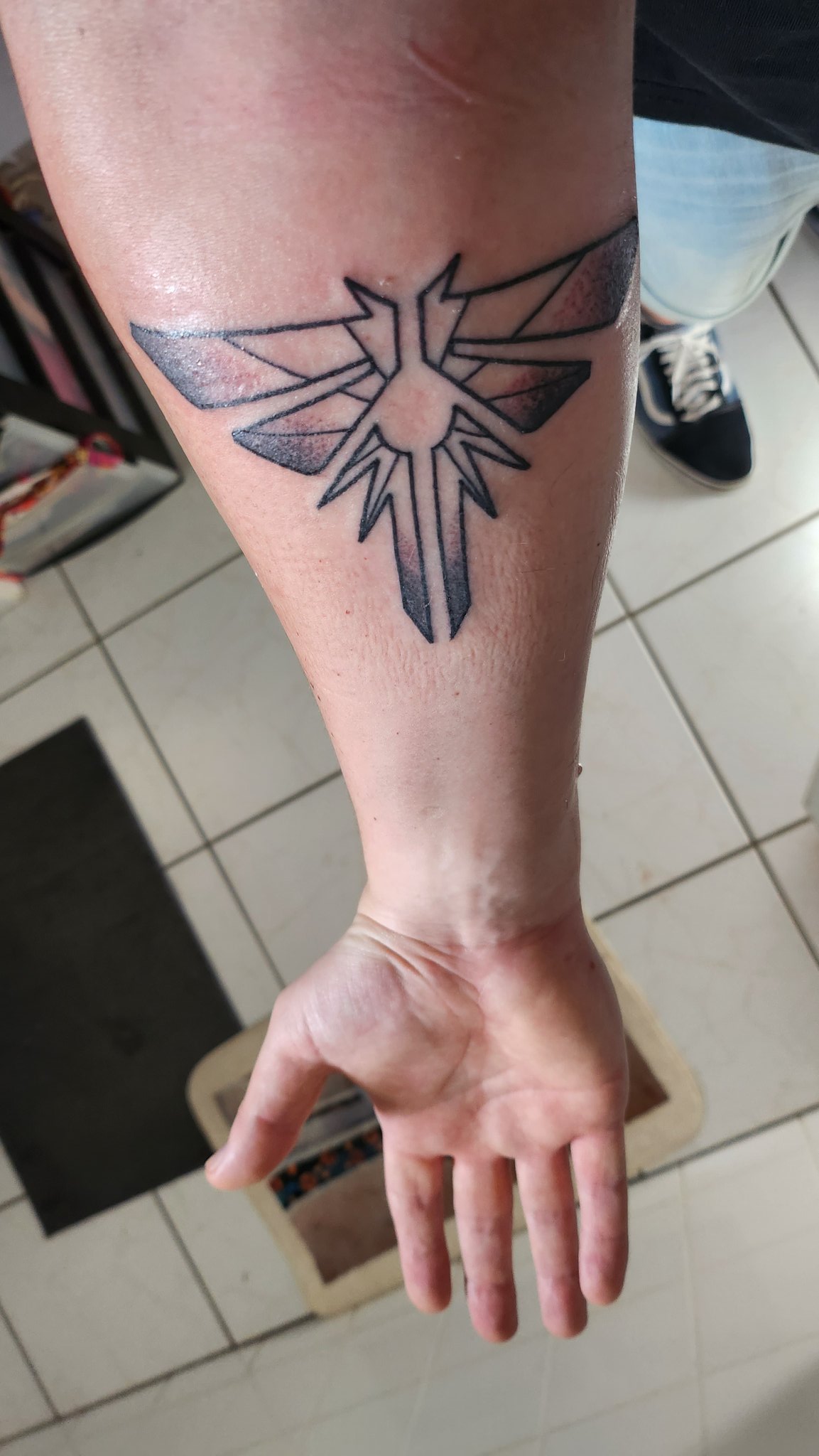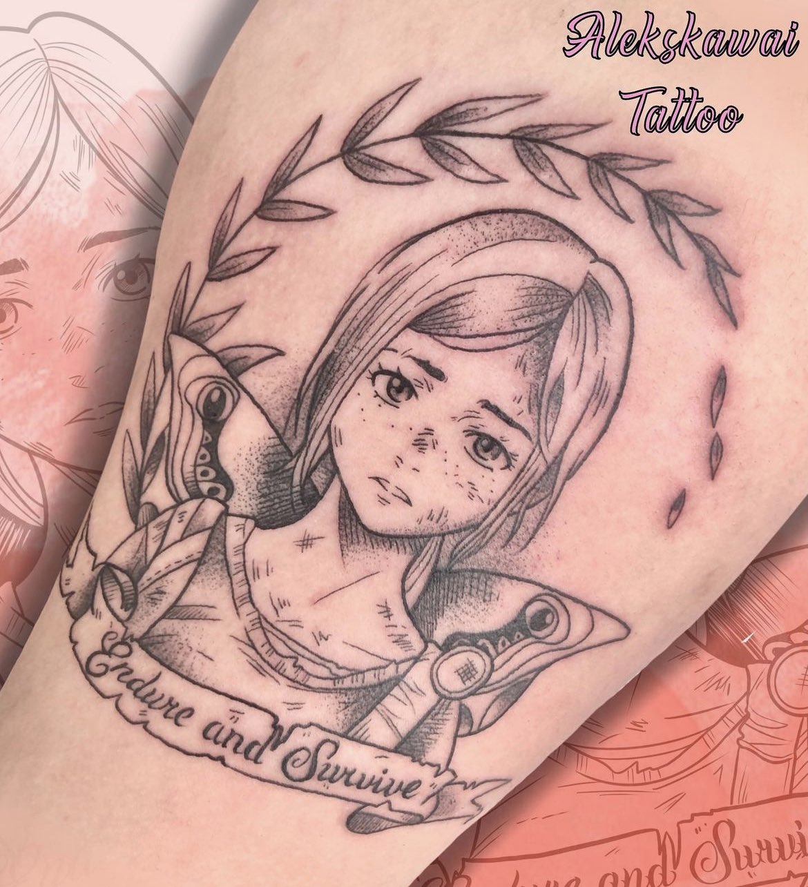 Mais ce n’est pas le seul. Une de nos nouvelles recrues, Aleks, s’est également fait tatouer une reproduction du tatouage d’Ellie sur le bras. Mais, ce n’est pas tout. Fut un temps, elle était elle-même tatoueuse. À l’époque, elle a ainsi pu décorer la peau d’une personne avec un portrait orné de symboles, à l’effigie de l’héroïne de The Last of Us.