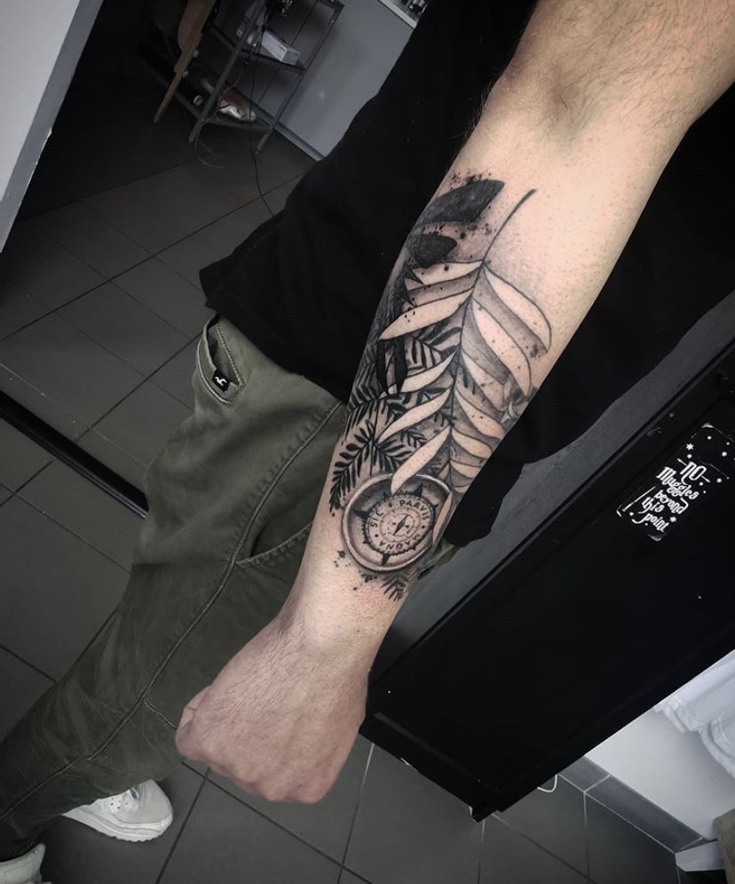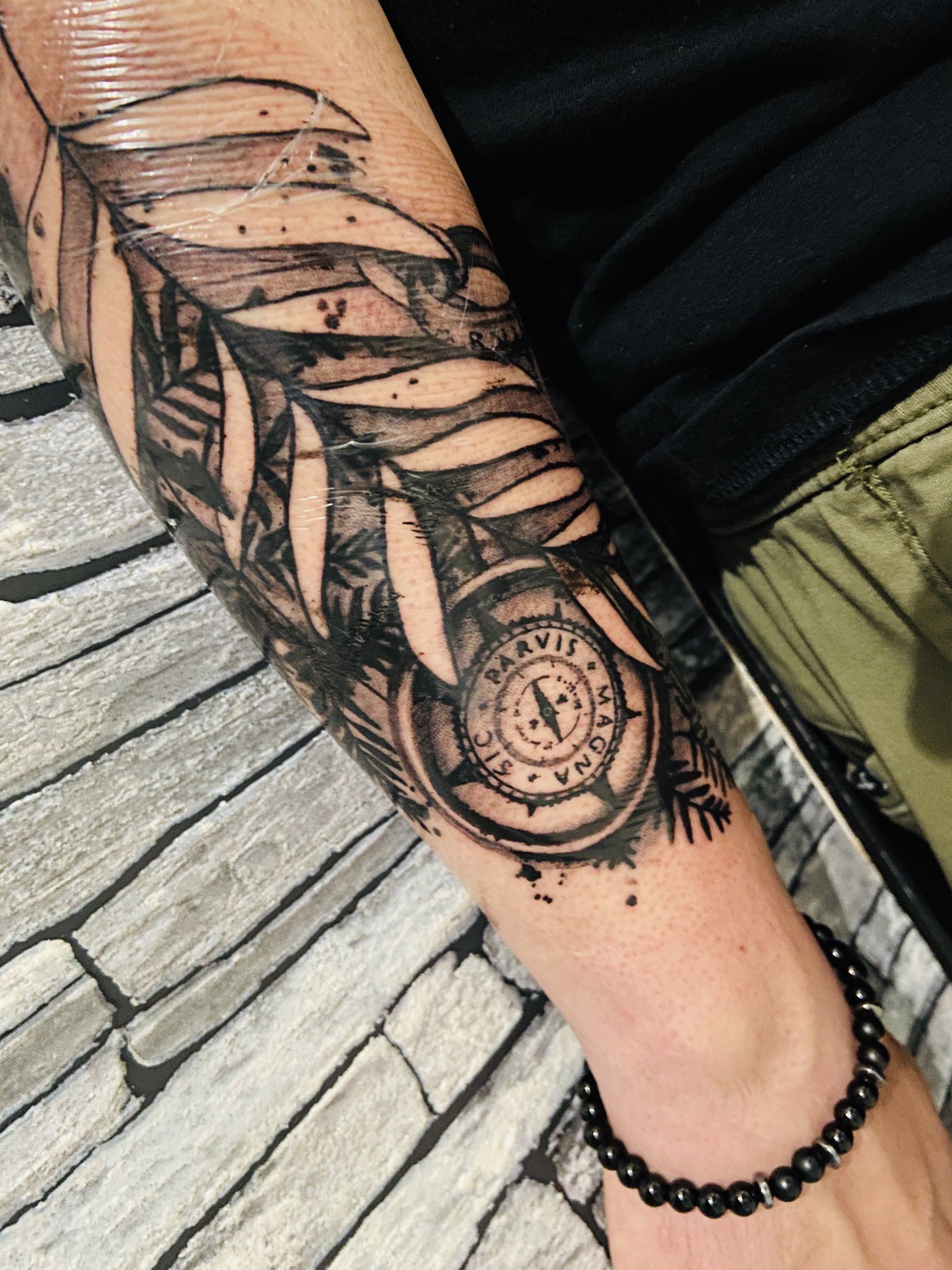 Il s’est donc offert un tatouage mêlant les deux univers : la fougère inspirée du tatouage d’Ellie, la boussole, référence évidente aux aventures de Nathan Drake. C’est la tatoueuse Udjinn Tattoo qui s’est occupée de cette création, au RND Shop de Mons (Belgique).