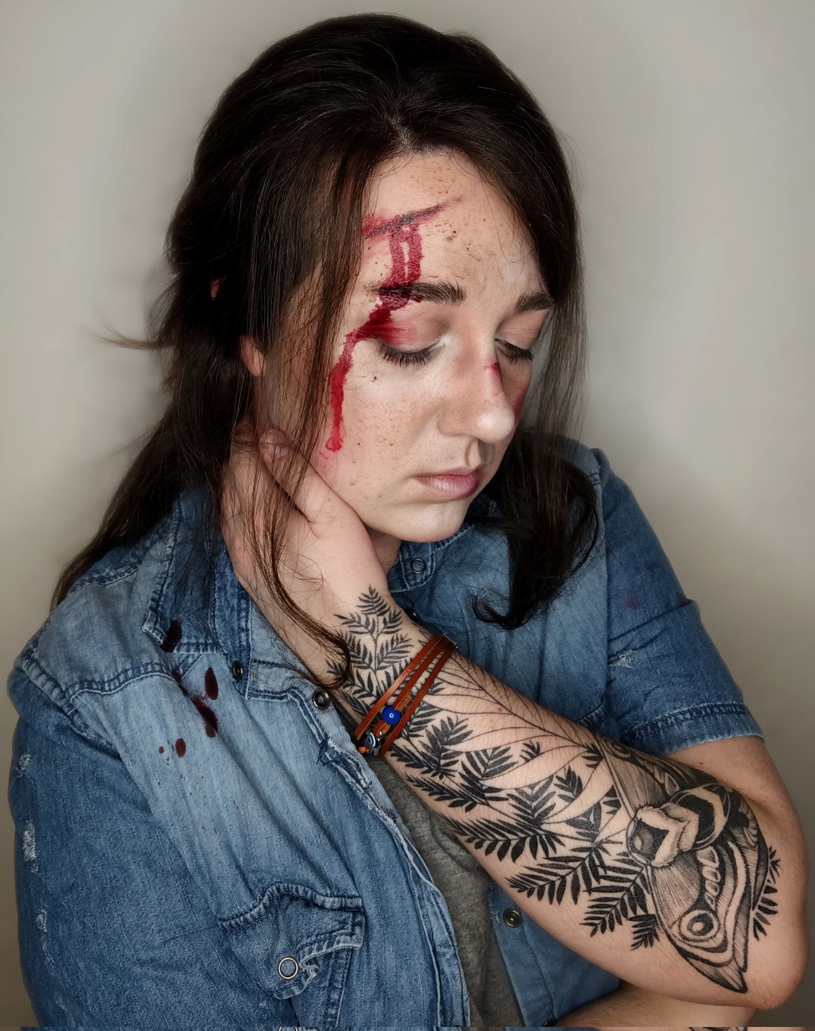 Charlène vit sa passion pour le cosplay et le make up sous le pseudo WHYƎWM. Aloy, Lara Croft, Nathan Drake… Elle met tout son talent à l’œuvre pour se transformer en des héros de jeu vidéo cultes. Mais quand il s’agit d’incarner Ellie, sa passion va au-delà du cosplay. De fait, elle a adopté le tatouage de l’héroïne, une création réalisée par le tattoo artist Le Testament. Celui-ci opère au salon Les Enfants particuliers, à Nancy.