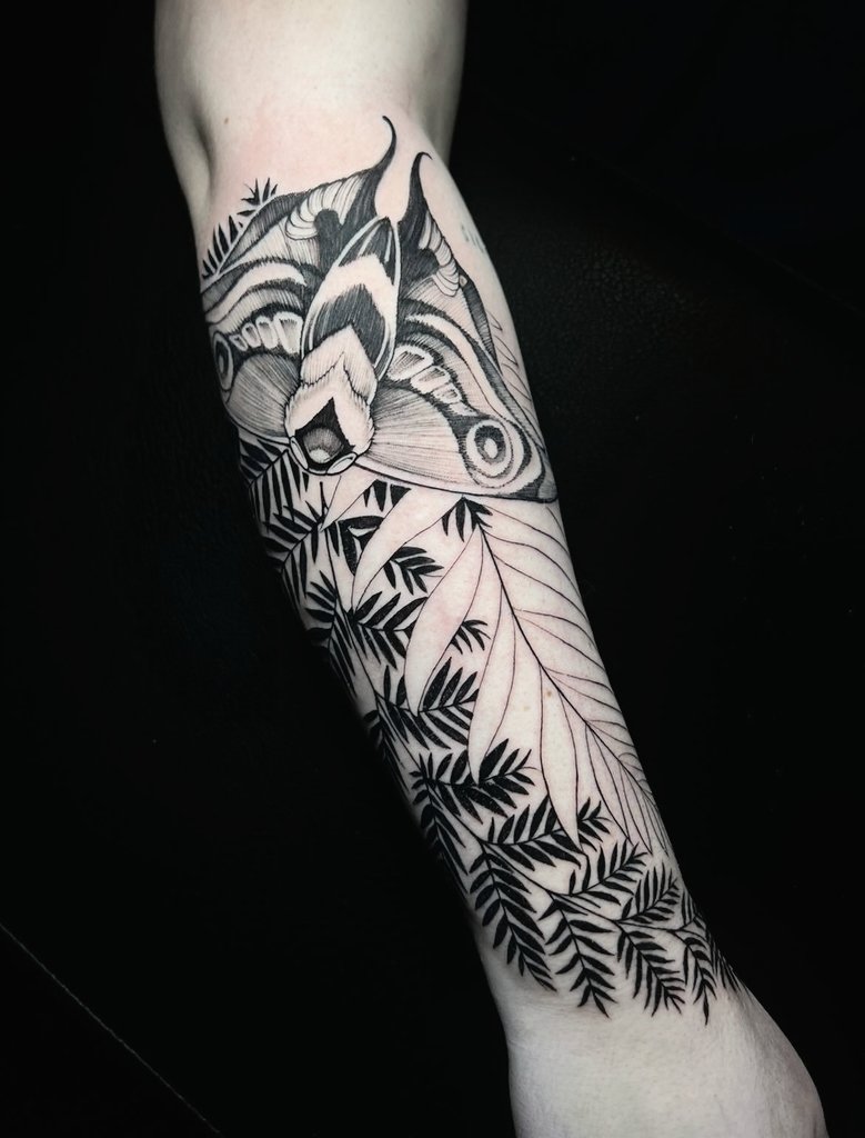 Marine, ensuite, s’est concentrée seulement sur les fougères. Elle ajoute ainsi une autre pièce à son bras joliment ornementé de motifs floraux et végétaux. Elle s’est faite tatouer au studio Les Fleurs noires, à Orléans (Loiret, France).