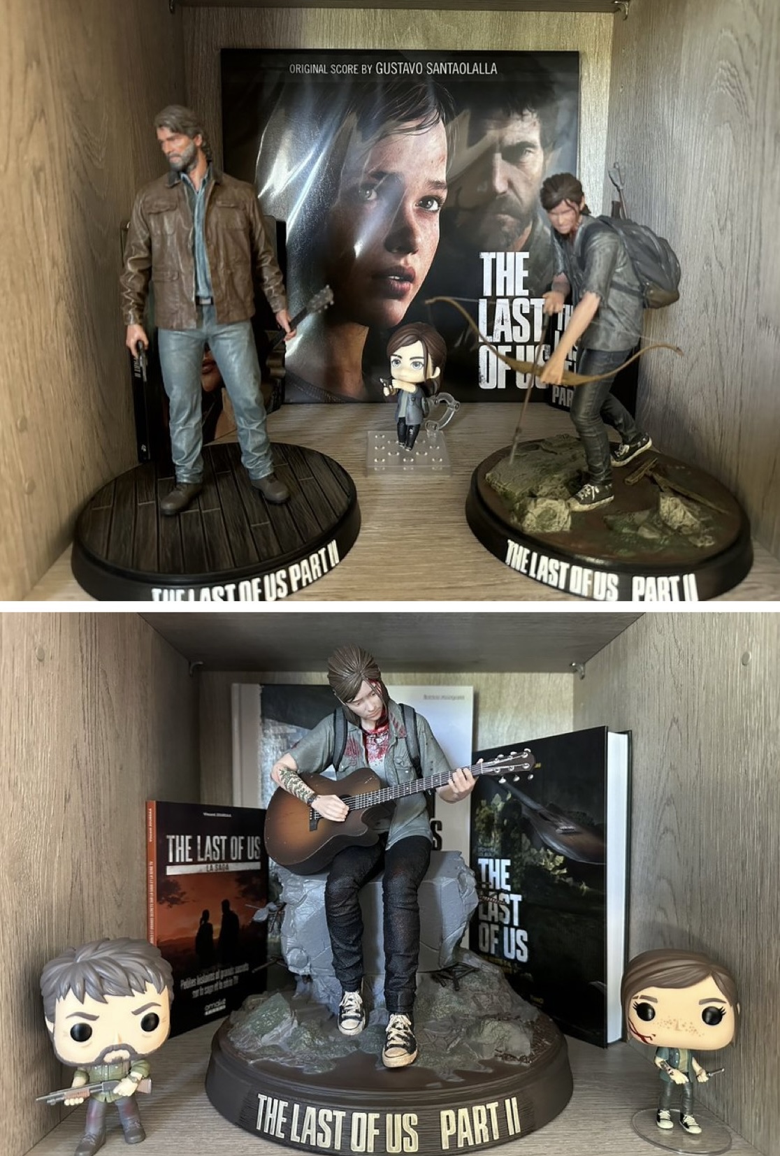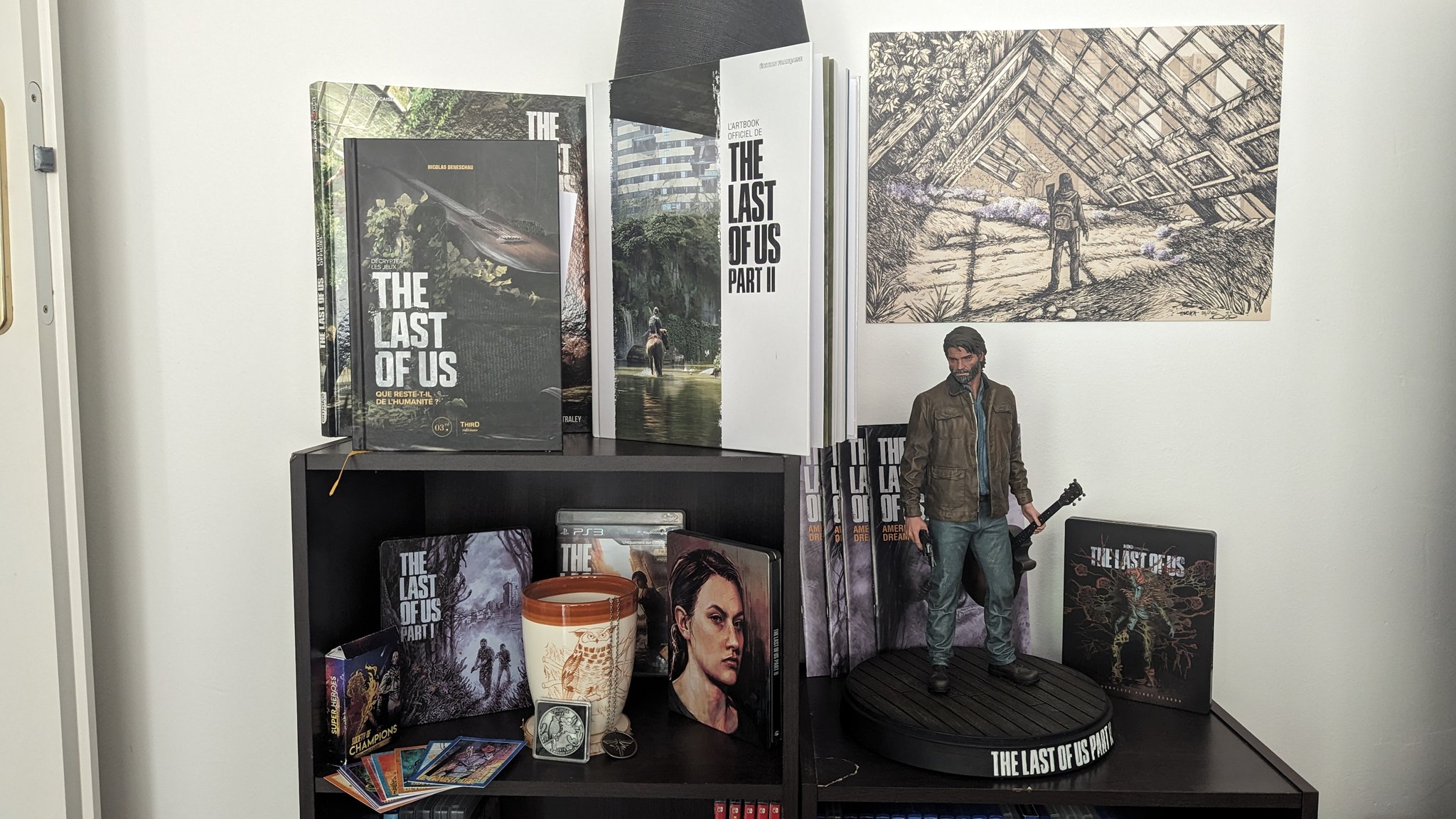 Un de nos rédacteurs, Arthur, nous partage pareillement sa belle collection. Tout en haut, on aperçoit deux vinyles de la bande originale du premier jeu, ainsi que celui du DLC Left Behind. Cette édition limitée à 5000 exemplaire était sortie à l’occasion de l’Outbreak Day de 2018. Ce double vinyles, comporte les illustrations originales de Sam Wolfe Connelly. Par ailleurs, il a aussi la chance d’avoir un magnifique présentoir The Last of Us Part II.