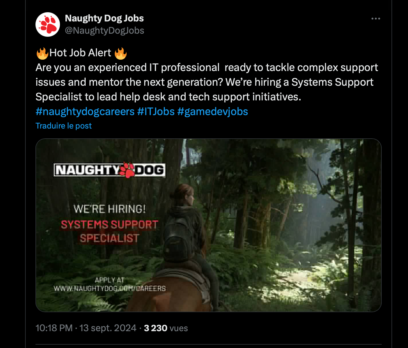 À première vue, ces offres d’emploi sont assez complexes. Pour le premier, de solides compétences en développement d’animations sont requises. Ce sont celles qui rythment les aventures d’Uncharted, ou encore les cinématiques iconiques de Joel et Ellie. Des compétences en technologie sont demandées pour la deuxième offre, mais aussi du savoir-faire dans la conception de niveaux pour la dernière.