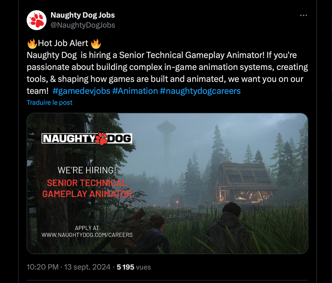 En effet, loin d’être à l’arrêt en termes de projets, le studio met régulièrement à jour sa page de recrutement. L’activité récurrente de cette ladite page est un bon signe, laissant penser que le studio est en bonne santé. En août dernier, une des annonces de recrutement a fait pas mal de bruit. En effet, The Last of Us Part III a pu être évoqué, sachant que dans cette offre d’emploi un Senior Gameplay Animator est invité à rejoindre les rangs d’autres développeurs.
