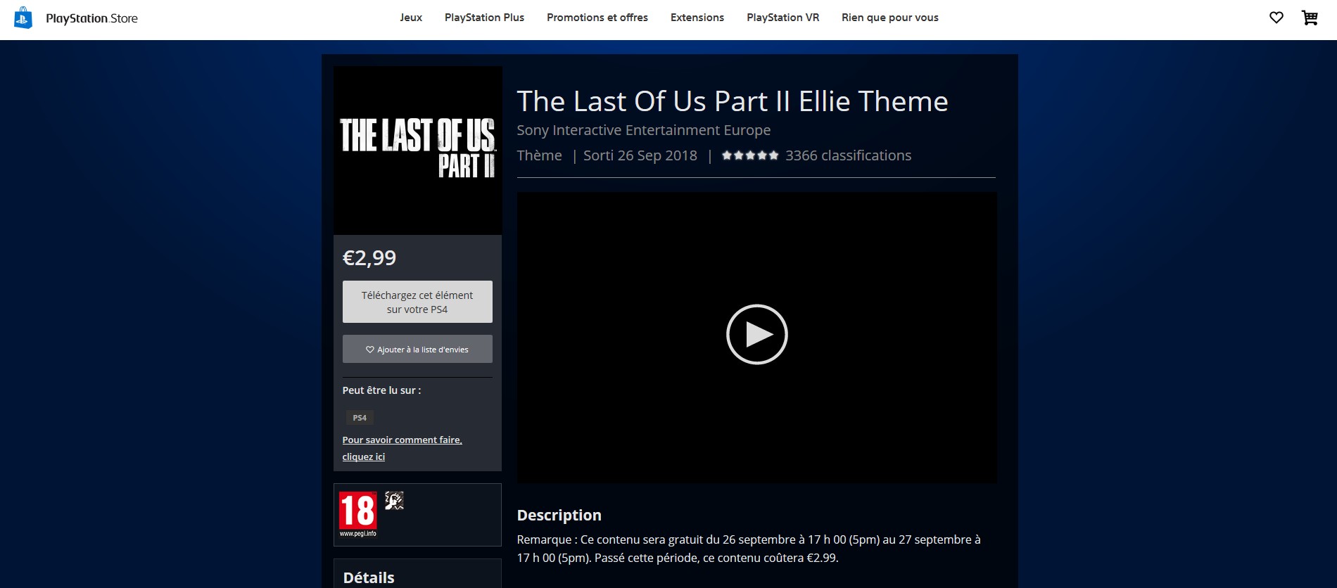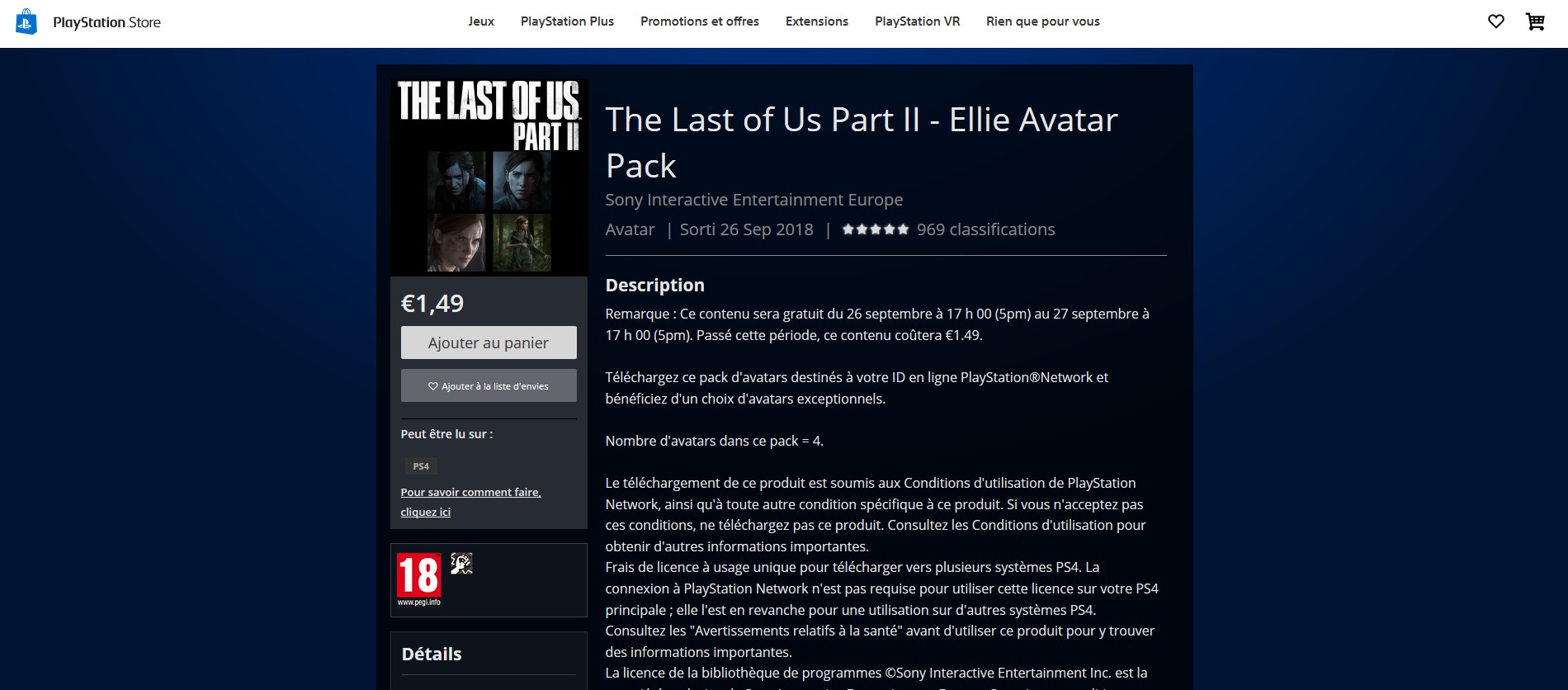 Mais ce n’est pas tout. Si vous vous rendez sur le PlayStation Store français, vous pourrez également remarquer qu’un thème et un pack d’avatars nommés « Ellie », actuellement payants, seront gratuits à partir de 17h. Ce changement sera effectif jusqu’au 27 septembre, même heure, après quoi il faudra à nouveau payer si vous voulez vous les procurer. Il s’agit en réalité du thème et des avatars de l’Outbreak Day de l’an dernier. Ainsi, si vous aviez manqué votre chance à l’époque, c’est le moment de vous rattraper.
