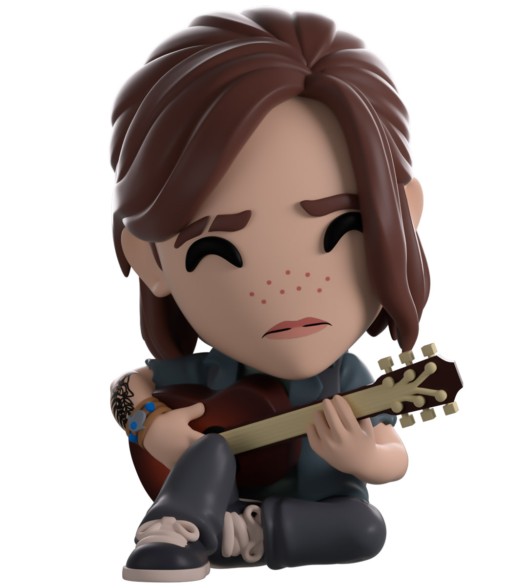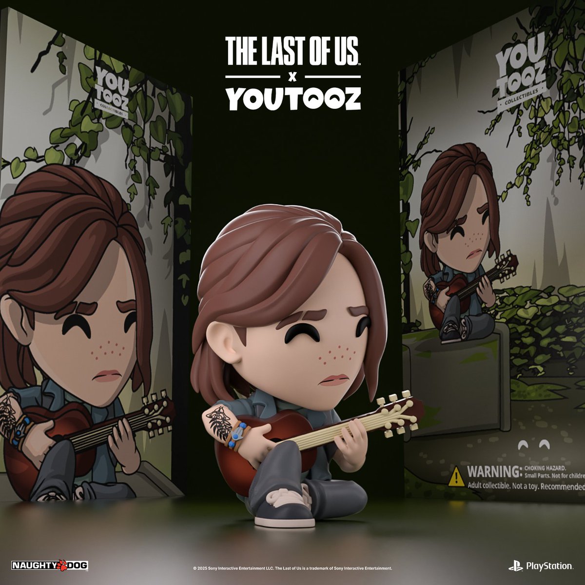 La première figurine proposée par Youtooz est à l’effigie d’Ellie. L’héroïne est mise en scène la guitare à la main, dans la même posture que sur l’artwork officiel de The Last of Us 2 la montrant contre un arbre, en train de jouer. Plus encore, le décor de la boîte renvoie directement à une scène du jeu, celle où elle joue “Take On Me” pour Dina, à Seattle.