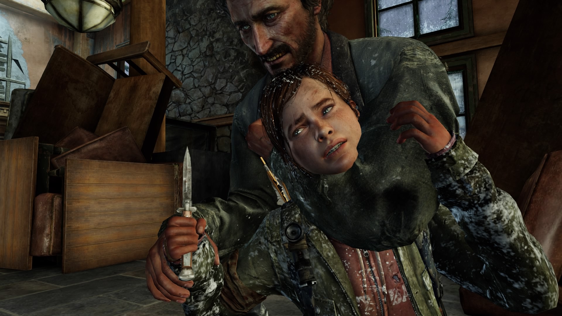 Malheureusement pour elle, le cauchemar ne fait que commencer. Le problème de Joel étant temporairement réglé – elle a effectivement réussi à le sauver –, elle doit désormais faire en sorte de trouver des vivres et de la nourriture afin de passer l’hiver. Tandis qu’il est toujours inconscient, elle part explorer les environs, seule, dotée de son expérience personnelle et des différents enseignements de Joel durant les derniers mois. C’est à ce moment-là qu’elle rencontre David. Personnage aussi complexe qu’intéressant (nous reviendrons plus en détail ultérieurement sur son rôle à jouer), il sera responsable du plus gros traumatisme que va subir Ellie au cours de cet hiver décidément monstrueux. L’homme, qui se présente avant tout comme une personne avenante et de confiance, va rapidement dévoiler son vrai visage : c’est de loin le personnage le plus vicieux et le plus dangereux rencontré au cours de l’aventure. Alors qu’Ellie était en situation de chasseuse, traquant des animaux pour se nourrir, elle va se retrouver en situation de proie aux mains de David et de ses hommes. Échappant de justesse à sa violence et à sa folie, elle va faire l’objet d’une véritable chasse à l’homme dans une séquence terriblement éprouvante, qui se terminera alors qu’elle se situe en bien mauvaise posture entre ses mains dans un bâtiment ravagé par les flammes.