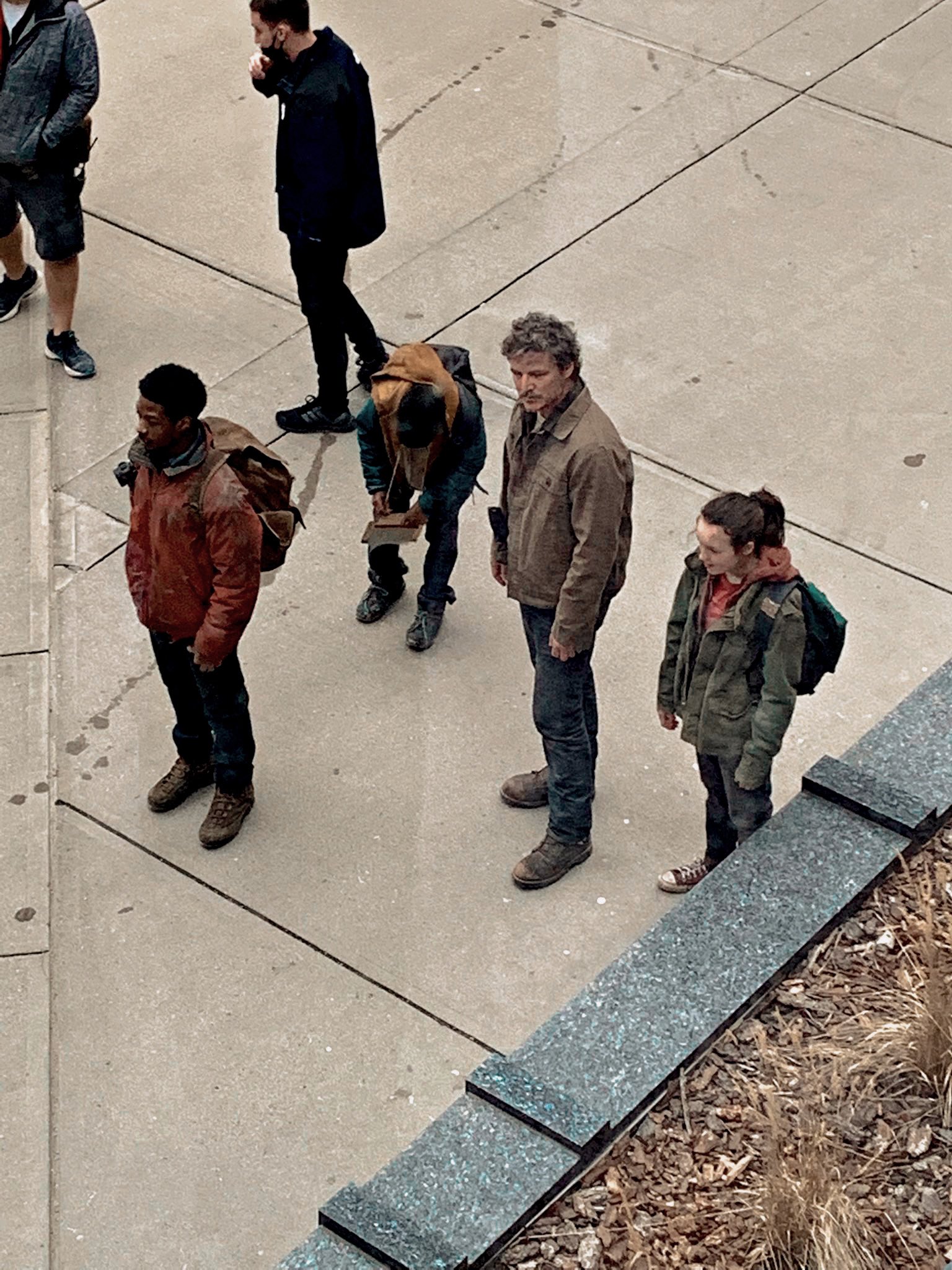 Cette vidéo montre les deux frères traverser une rue en compagnie d’Ellie (Bella Ramsey) et Joel (Pedro Pascal). La séquence se situe bien évidemment à Pittsburgh, alors que les quatre personnages essaient d’échapper aux chasseurs. D’après la description donnée par dbaxter1304, les caméras auraient été placées à l’intérieur du bâtiment, de manière à filmer les personnages en action depuis l’entrée de l’immeuble.