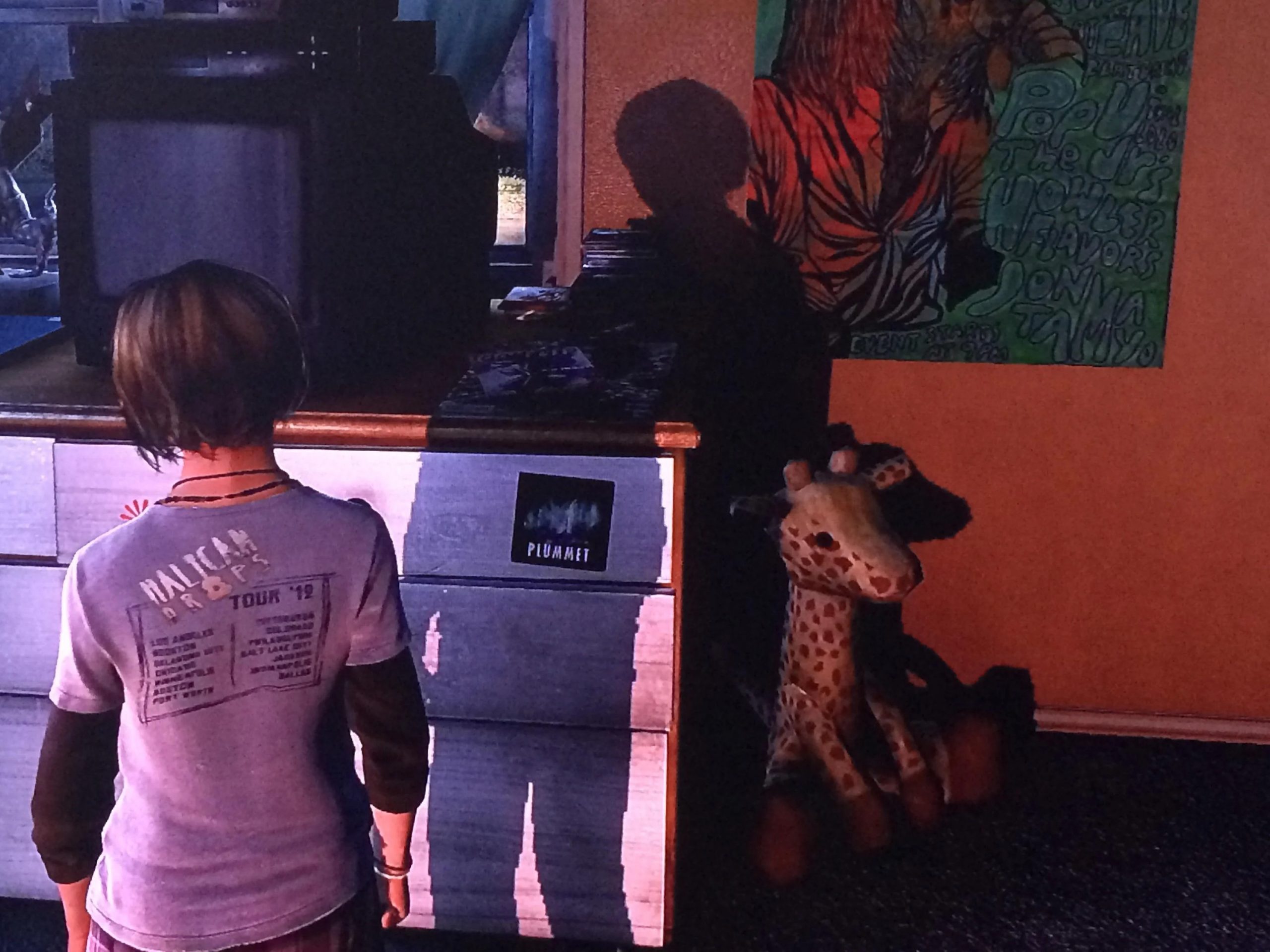 Une fois remis en route, nos personnages traversent une Boston abandonnée. Druckmann pose sa caméra au sol afin de faire un gros plan sur un jouet délaissé à côté d’une voiture. Il s’agit d’une peluche de girafe, objet qu’on retrouve à de nombreuses reprises dans le jeu.