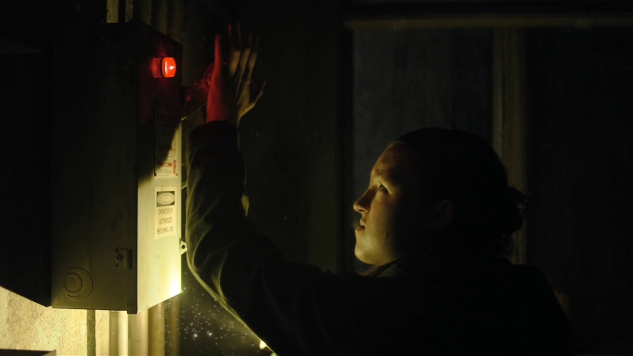 Une fois traversé ce décor presque irréel de l’hôpital, Ellie est sur le point de rejoindre Nora, prise au piège. Sur son chemin, l’héroïne passe devant un panneau électrique et prend soin de rallumer le courant. C’est alors que la lumière rouge, synonyme d’alerte, si iconique du jeu s’invite enfin dans la série The Last of Us.