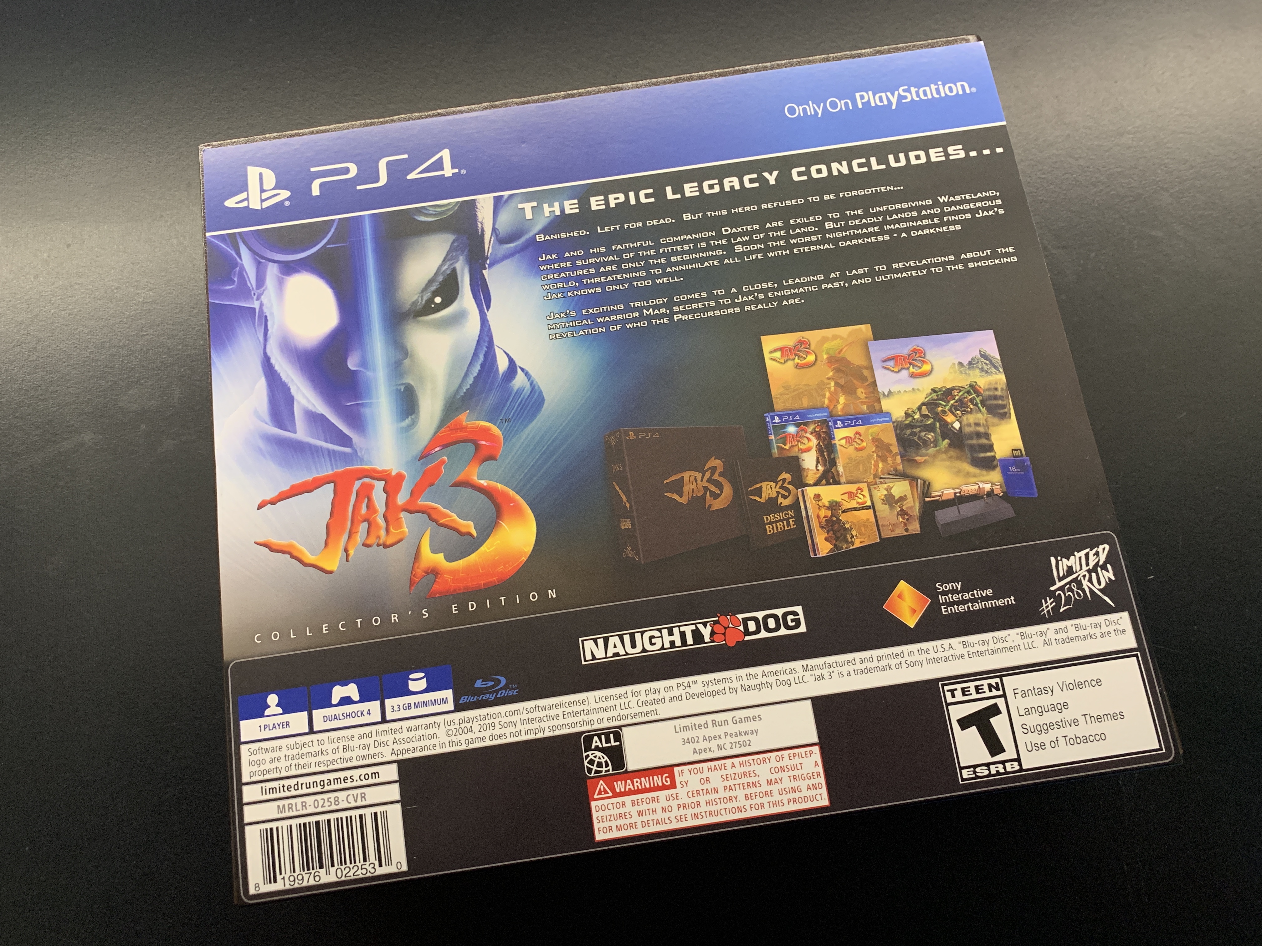 Après plusieurs mois de disponibilité sur PS4 en version dématérialisée, il est enfin possible (pour de rares chanceux) d’avoir une version physique de Jak & Daxter, Jak II, Jak 3 et plus tard cette année Jak X ! Pour cette version de Jak 3, elle dispose de sa jaquette originale (version US) et d’une version alternative 2019 qui est vraiment sympa !